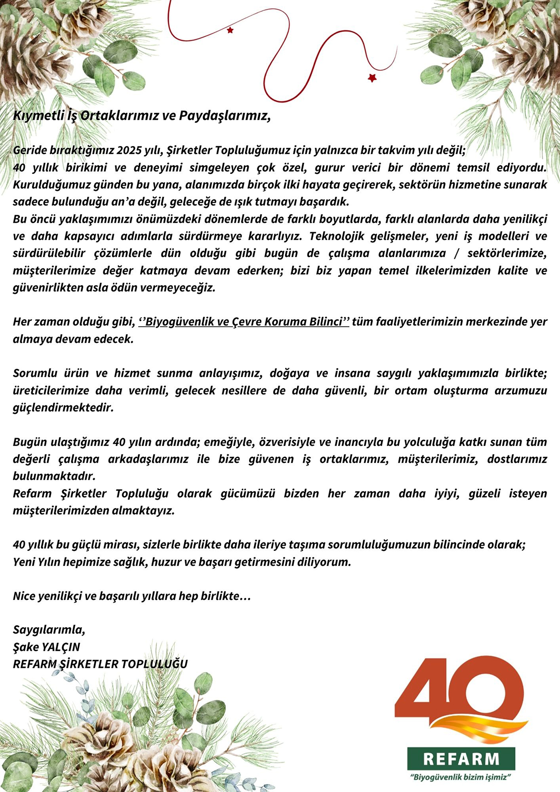 40.yılımıza yaklaşırken “Biyogüvenlik bizim işimiz” mottomuzla faaliyet gösterdiğimiz sektörler özelinde birçok yeni ve yenilikçi fikirler ile, üreticilerin daha verimli olmaları için girişimlerde bulunmaya, ekonomik ürün ve hizmetler sunmaya devam edeceğiz.